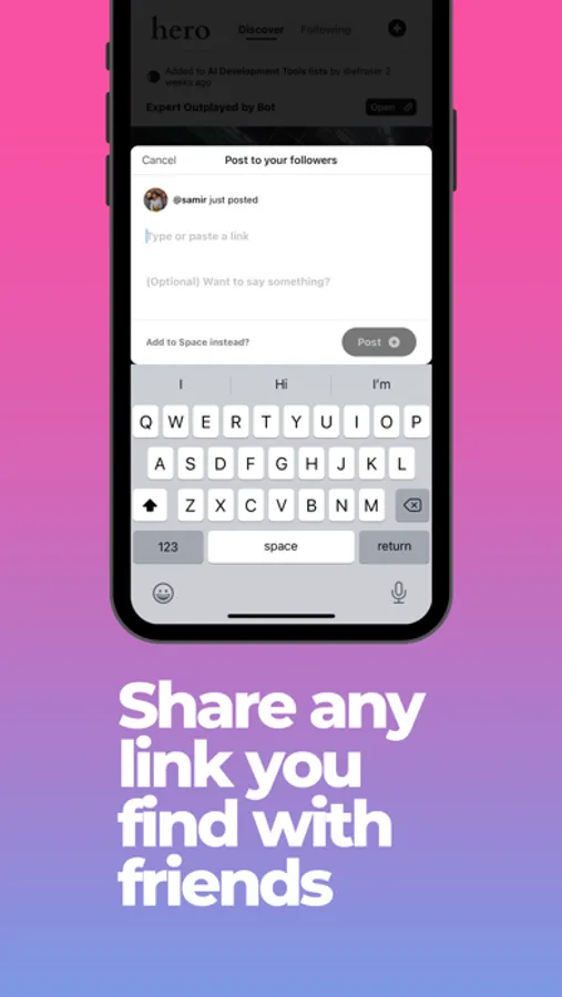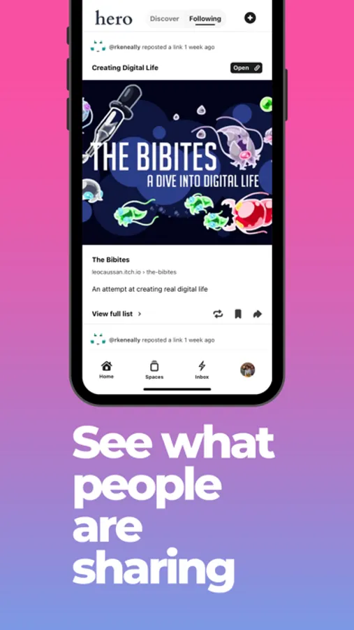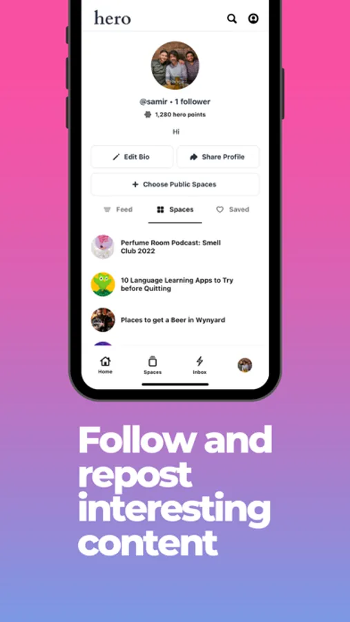 Hero also lets you add friends and invite them to build Spaces together! Whether you're a group of friends or students, a family, or a business that loves to share interesting things, Hero is here to save the day!