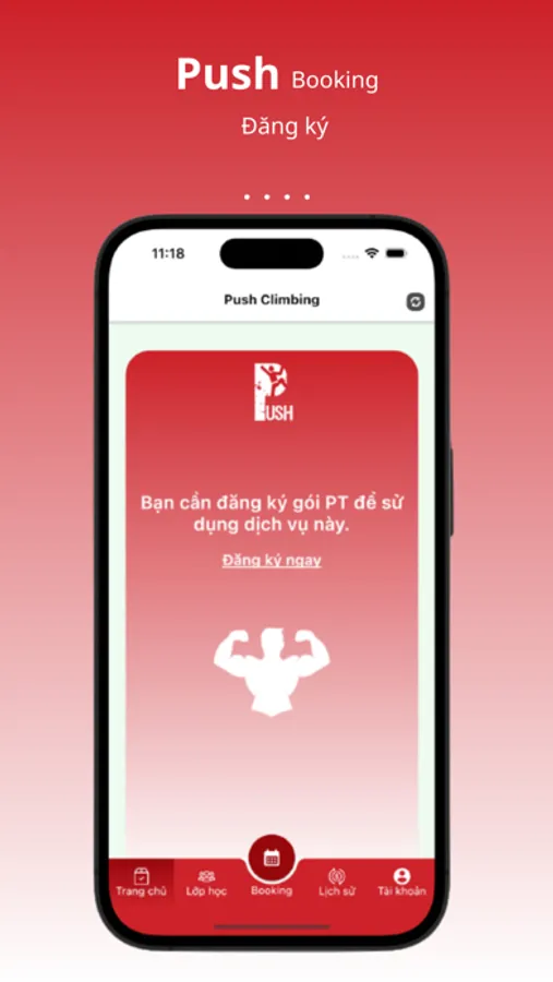 Pushclimbing Booking là ứng dụng đặt lịch trực tuyến dành cho lĩnh vực gym. Hội viên sau khi ký và đăng nhập tài khoản trên ứng dụng. Hội viên sẽ Chọn địa điểm, thời gian giờ tập trong tuần và huấn luyện viên, các HLV sẽ đến tập luyện cùng bạn, mọi lúc, mọi nơi!