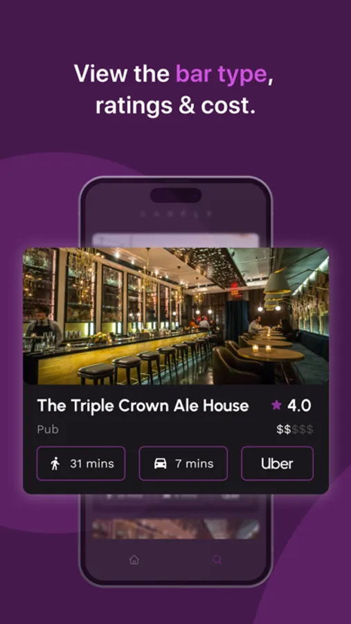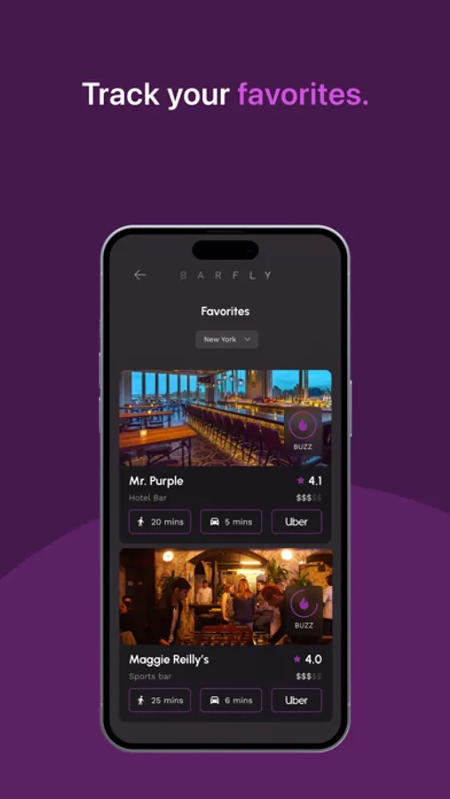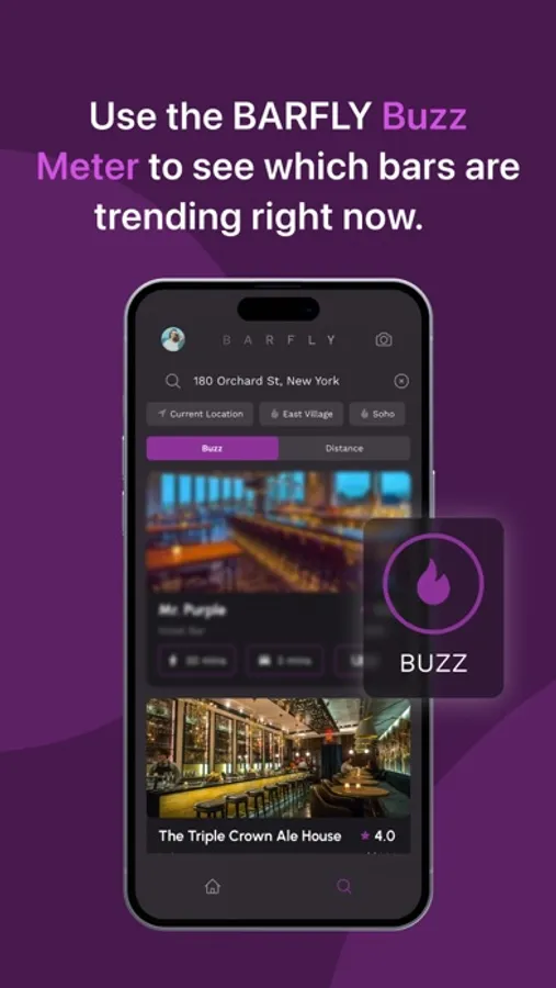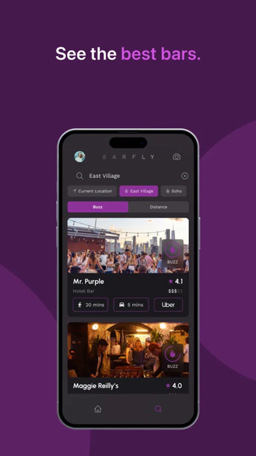 • A toggle between Buzz and Distance - Buzz ranks bars by real-time popularity and Distance ranks bars by proximity.