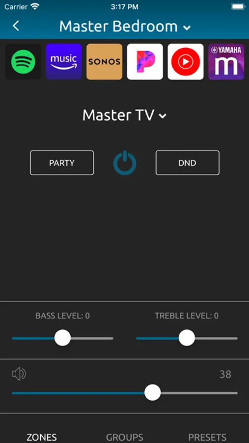 Presets: Create audio scenes called presets that set up multiple zones in your home with a single button press. For every zone set power on/off, source, volume, and DND (Do Not Disturb, Lync only).