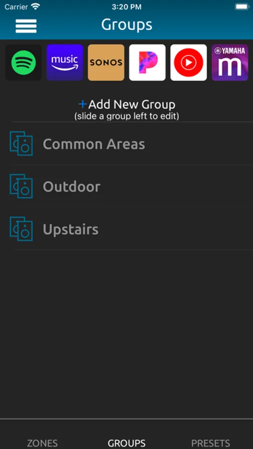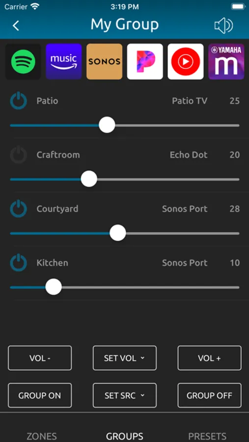 Zone Groups: Create groups of zones to set a common source, set a common volume, or relatively control volume across multiple zones.