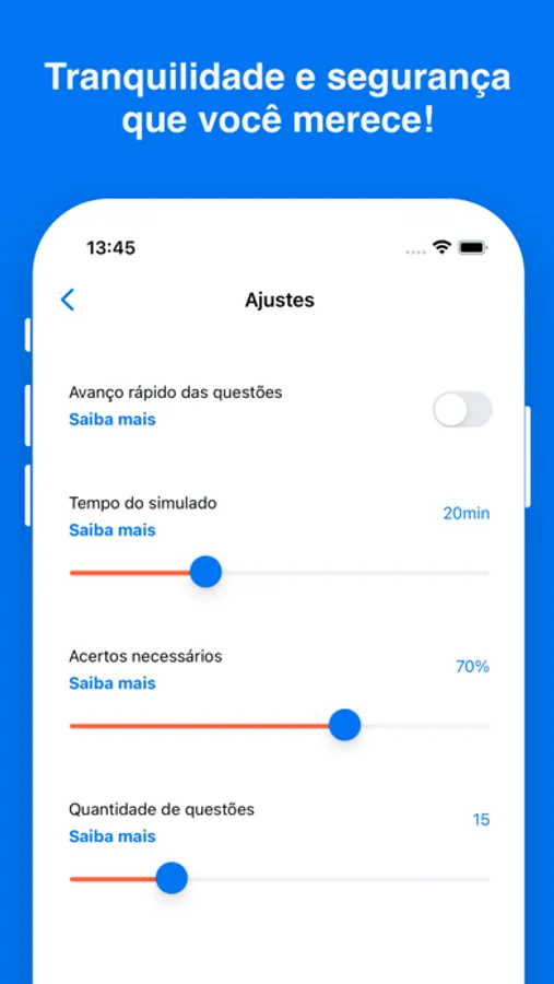 Além disso, nosso aplicativo é extremamente fácil de usar. Com uma interface simples e intuitiva, você pode facilmente navegar pelos simulados e monitorar seu progresso. Você também pode personalizar seus estudos, selecionando o número de perguntas em cada teste e escolhendo as áreas específicas que deseja focar.