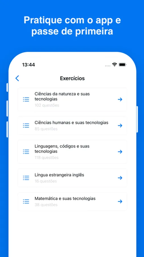 * Estudos personalizados: escolha quantidade de questões e áreas (Matemática, Linguagens, Natureza e Humanas).