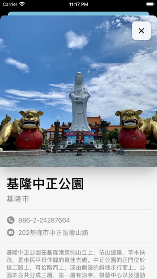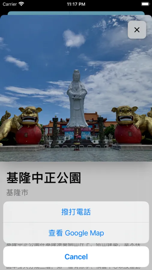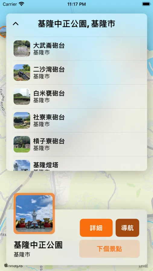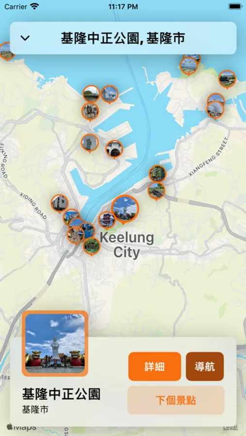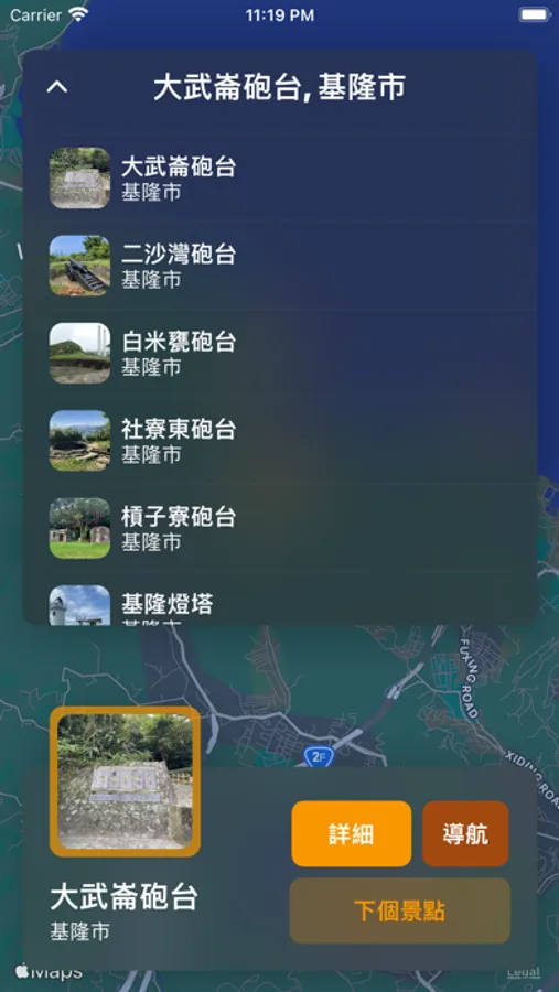 可利用直接點擊圖標或上方清單列來連動資料,點擊詳細可跳轉至詳細頁面,點擊導航可直接使用Apple Map前往。此外介面中有直接跳轉下一個景點功能,亦可連動上方頁面所有資料。