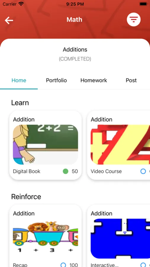 Reinforce comprises conceptual videos and daily recap cards that aim to revise the daily learnings.