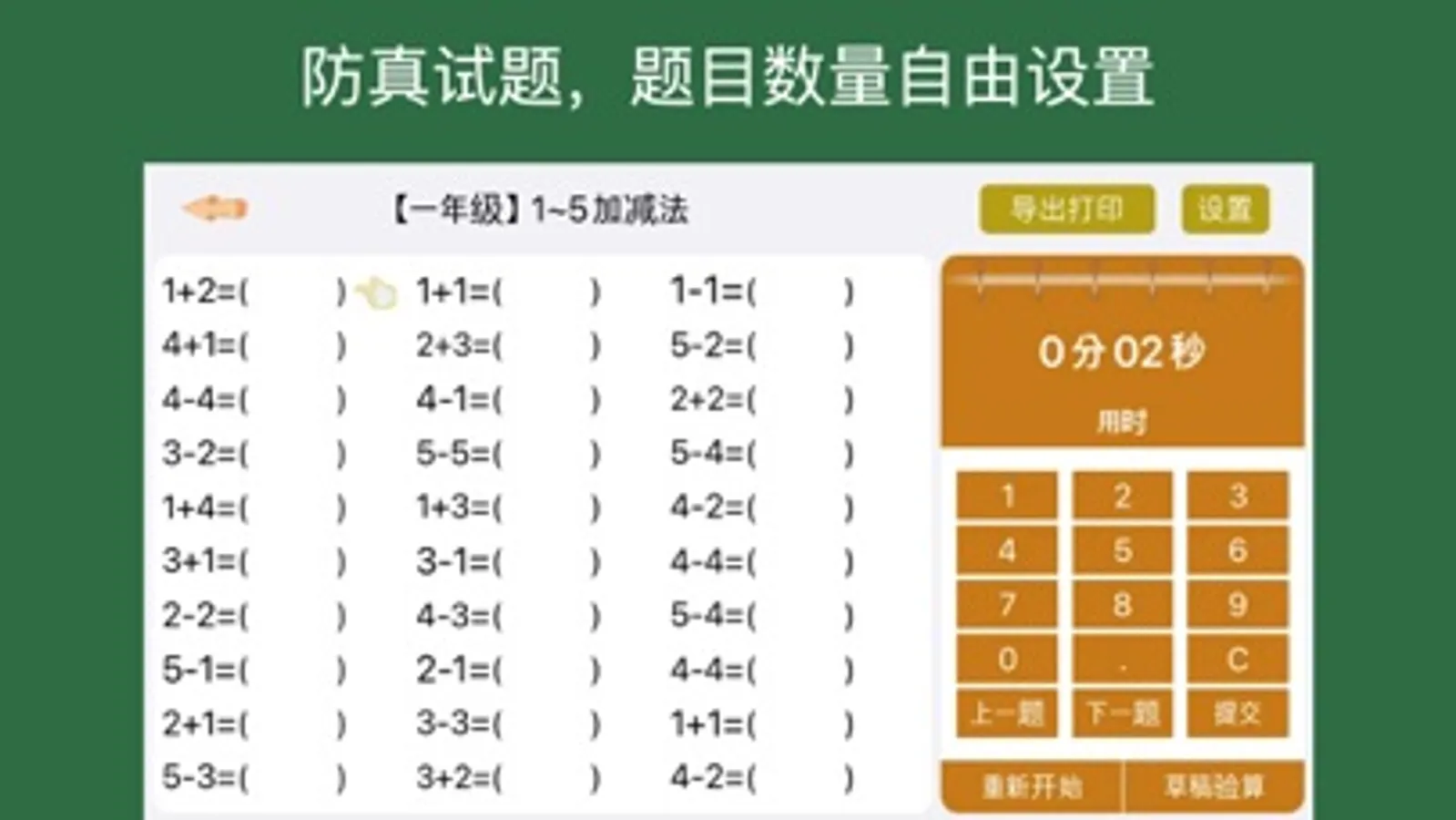 小学数学模拟纸张试题口算防真练习,自动检查正确性,错题改正及记录,试题导出打印,小学1~6年级数学口算轻松练;