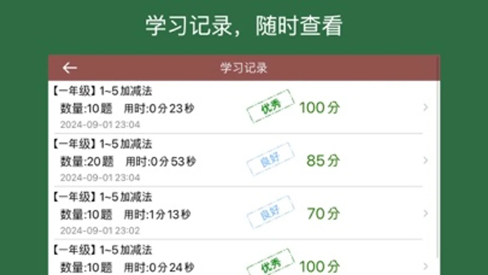 * 学习记录追踪:随时查看历史练习数据,薄弱点一目了然;