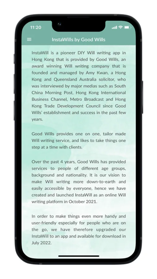 InstaWill is a pioneer DIY Will writing app in Hong Kong that is provided by Good Wills, an award winning Will writing company that is founded and managed by Amy Kwan, a Hong Kong and Queensland Australia solicitor, who was interviewed by major medias such as South China Morning Post, Hong Kong International Business Channel, Metro Broadcast and Hong Kong Trade Development Council since Good Wills’ establishment and success in the past few years.