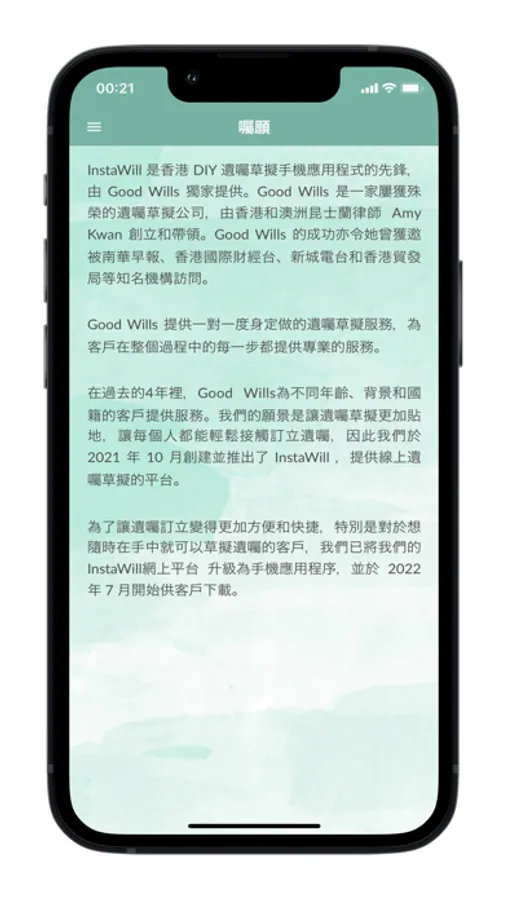 為了讓遺囑訂立變得更加方便和快捷,特別是對於想隨時在手中就可以草擬遺囑的客戶,我們已將我們的 InstaWill網上平台 升級為手機應用程序,並於 2022 年 7 月開始供客戶下載。