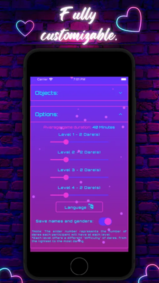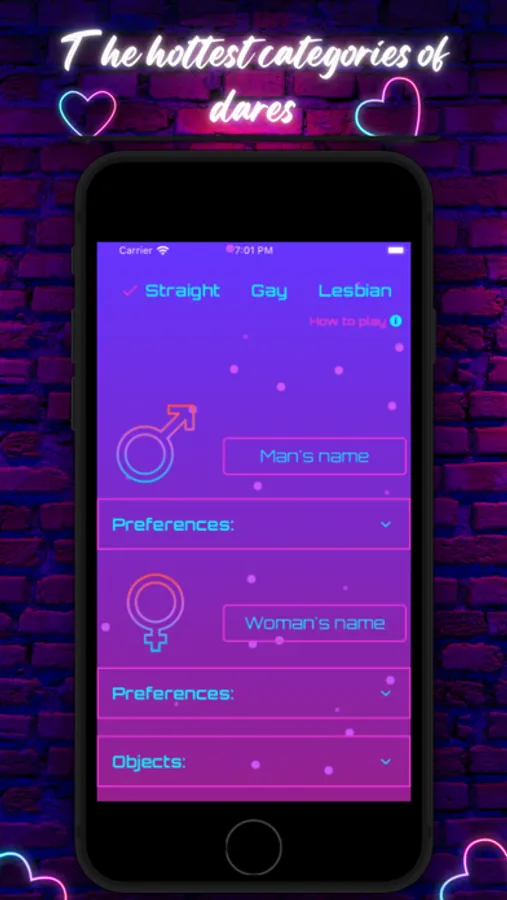 The dares will be presented according to the preferences and objects selected on the main screen, leaving the game the way you want it, with only what you like.