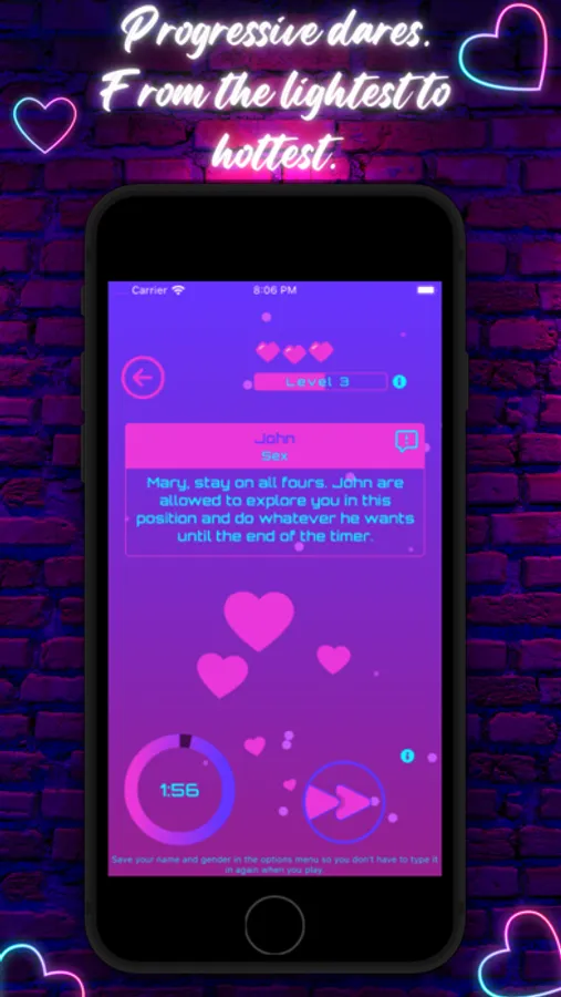 NaughtyApp is a dare game for couples who want to have fun, discover new things, get out of the routine and spice up the relationship, surprise yourself with our more than 2500 hot dares, you will not regret it.