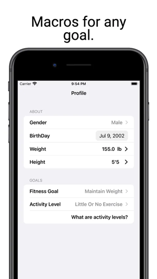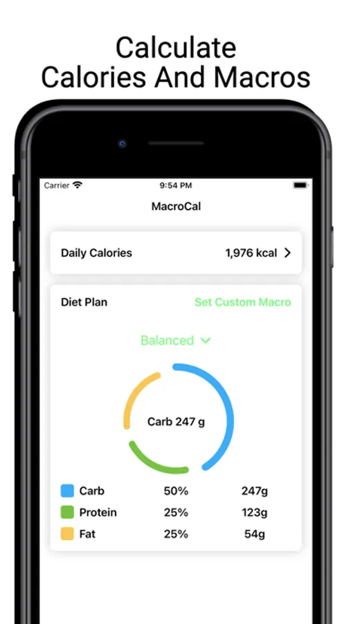 NOTE: MacroCal is not a medical app. Suggested calorie intake is just an estimate based on your profile. Please consult your health provider if you want to use it for medical purposes or to obtain specific diet needs.