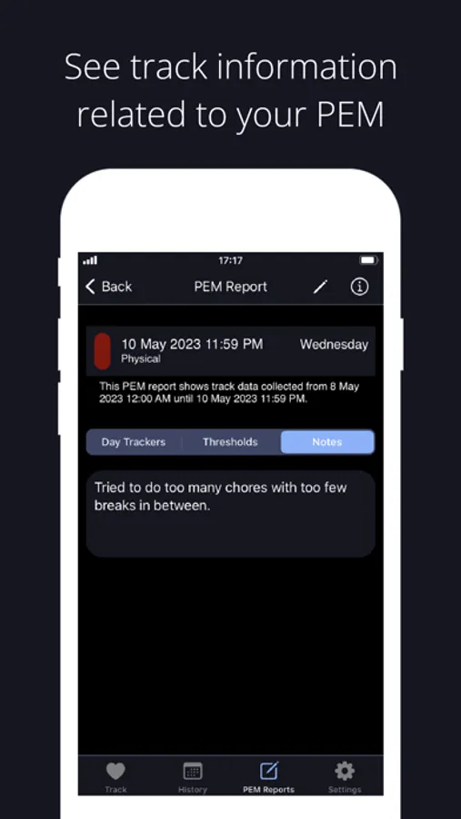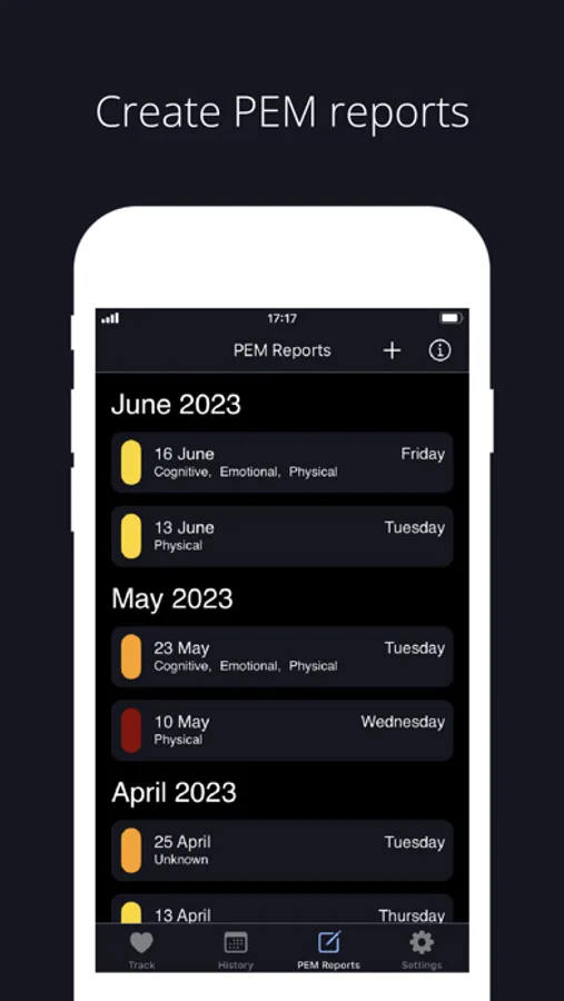 Get an overview of your relapses and see potential patterns by generating PEM reports. View detailed track information about the days before your PEM.