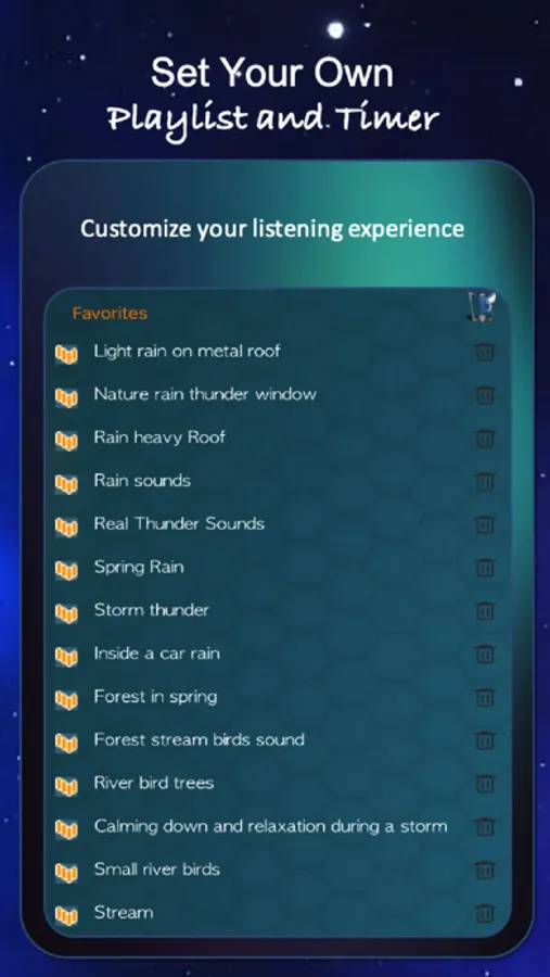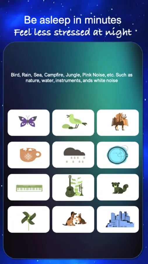 Amazon Jungle, Beach Waves Crashing, Blowing Wind, Brown Noise, Camp Fire, City Streets, Crickets Chirping, Crowded Room, Rinsing, Extreme Rain Pouring, Frogs at Night, Grandfather Clock, Hair Dryer Blowing, Heartbeat, Heavy Rain Pouring, Light Rain Pouring, Ocean Waves Crashing, Oscillating Fan, Pink Noise, Rain on Car Roof, Rain Storm, Running Shower, Running Water, Stream Water Flowing, Thunder Storm, Tibetan Singing Bowl, Train Ride, Vacuum Cleaner, Violet Noise, Water Dripping, Water Sprinkler, White Noise