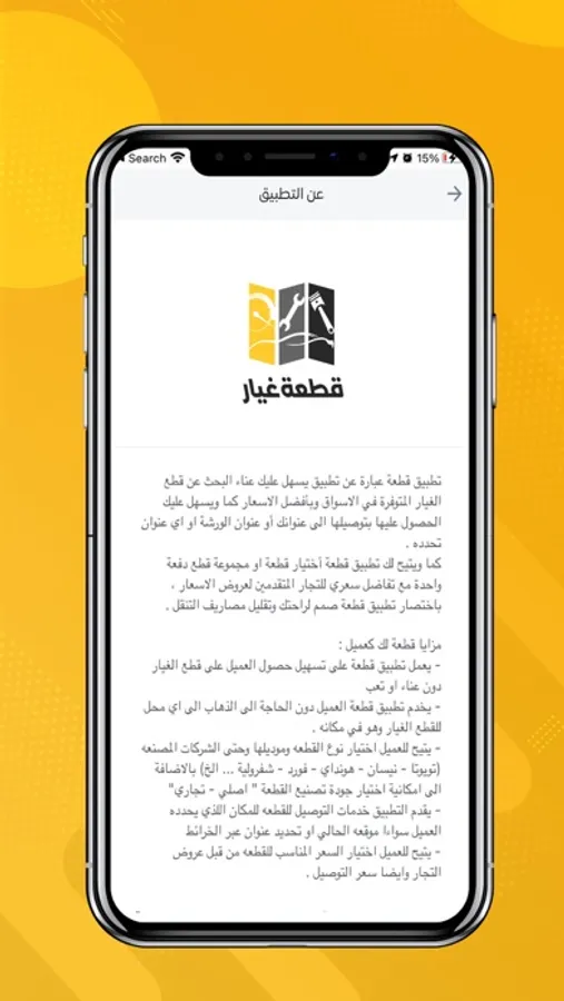 تطبيق قطعة غيار عبارة عن تطبيق يسهل عليك عناء البحث عن قطع الغيار المتوفرة في الاسواق وبأفضل الاسعار كما ويسهل عليك الحصول عليها بتوصيلها الى عنوانك أو عنوان الورشة او اي عنوان تحدده .