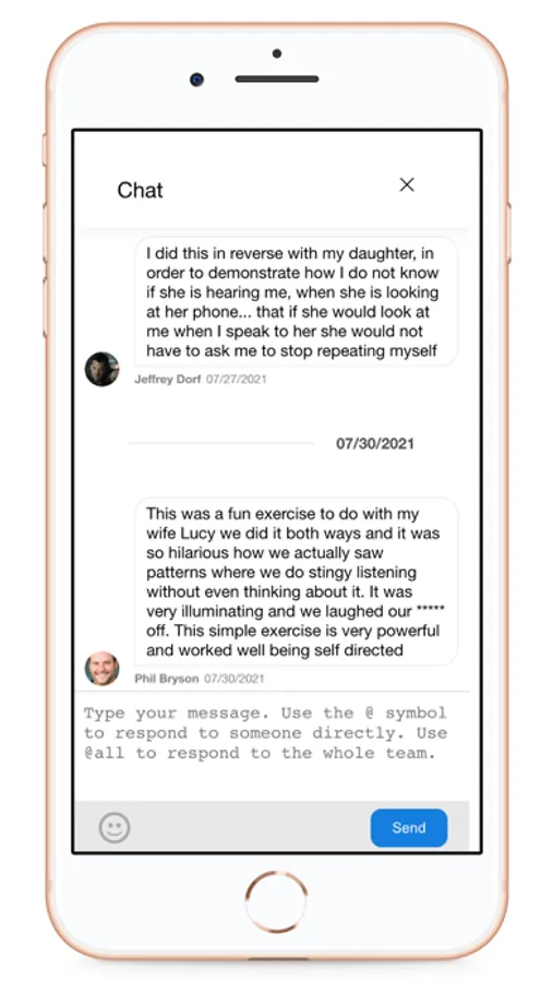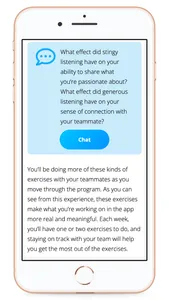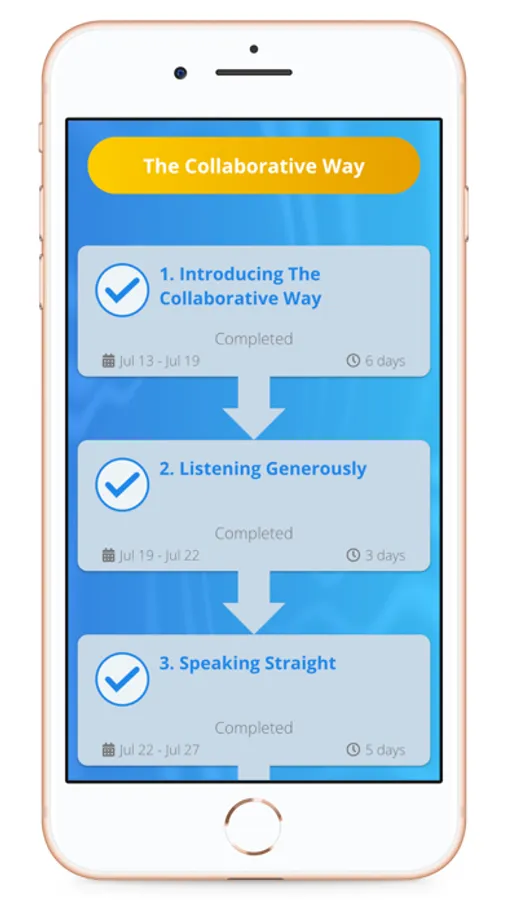 Your team will learn the five core elements of The Collaborative Way: Listening Generously, Speaking Straight, Being For Each Other, Honoring Commitments, and Acknowledgement and Appreciation by watching videos and animations, taking quizzes and surveys, and chatting with your teammates in the app. You’ll also have the opportunity to take what you’ve learned and make it real through weekly exercises that you complete outside of the app. This innovative way of training your team gives you the benefits of in-person training without the drawbacks of pulling all of your team members away from their workplace responsibilities.