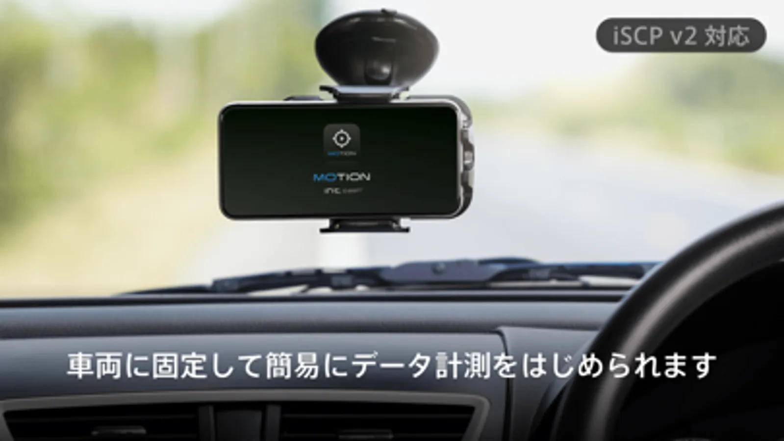 例えば自動車のダッシュボードに固定して計測を行うことで、車両の挙動や前方映像の収集を手軽に行うことができます。