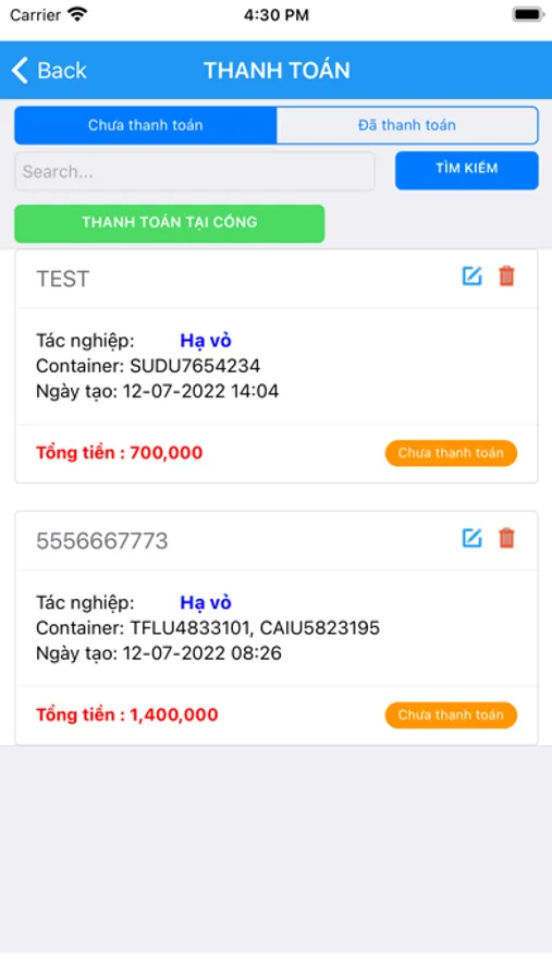 - Thanh toán toàn bộ các dịch vụ bãi của SITC - Đình Vũ.