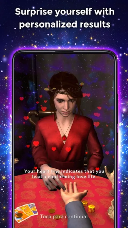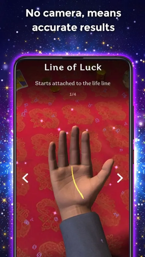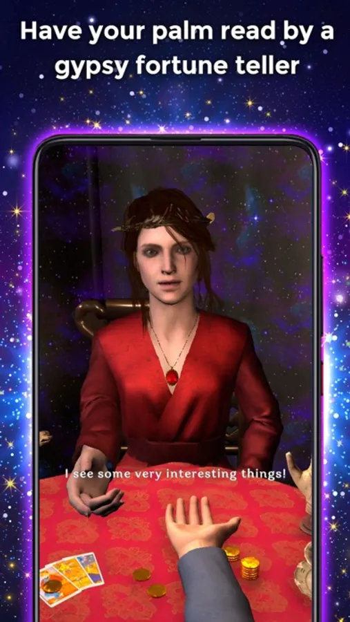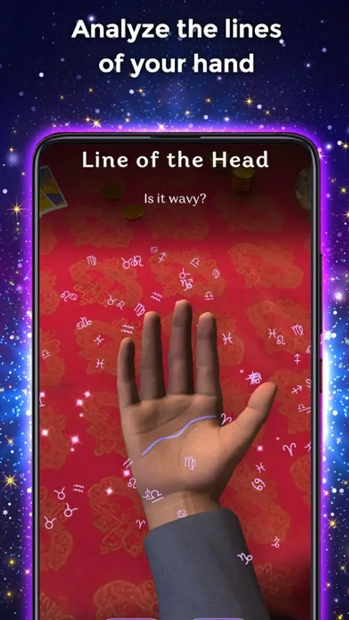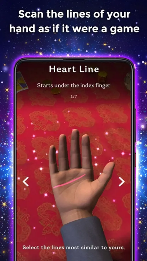 As stated above, the palm reader is not a scanner. This means that you must select the hand lines manually by completing a short questionnaire that will take you 2 minutes. This allows a much higher accuracy and reliability. Finally, the gypsy fortune teller will read and interpret the lines on your palm, offering surprising results.