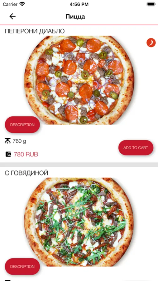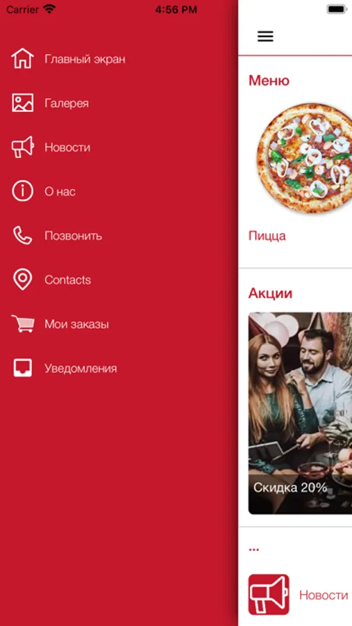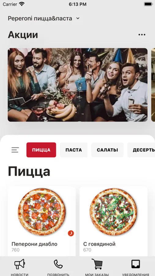 Приложение Pepperoni для информирования об акциях, оформления заказов на доставку, бронирование столиков
