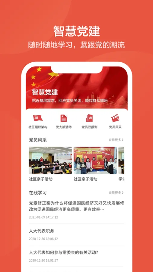 智慧施营社区APP专门为施营居民提供便捷的在线服务包含在线报事,周边商家,在线服务,智慧党建等