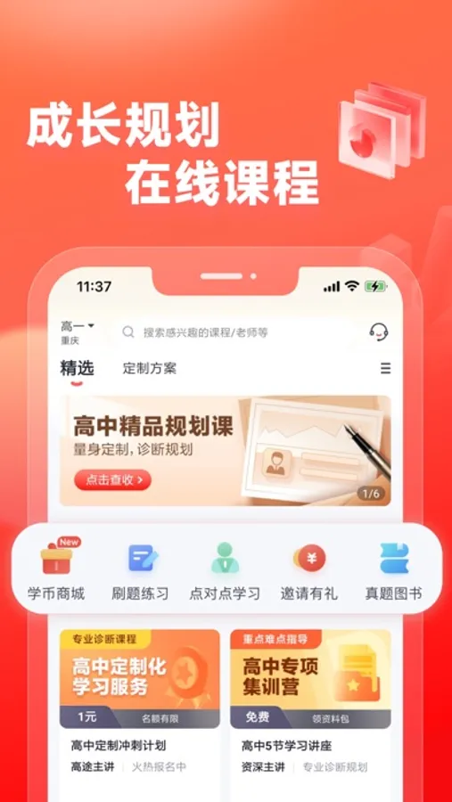规划精品 APP,以完整的高中知识体系为框架、以科学的高中学习方法为核心,专为普通高中、职业高中、成人自考等用户群体提供音像制品学习,学习方法指导、学习能力培养、志愿选科,升学成长规划等一系列个性化提升方案。规划精品智能学习系统通过大数据、AI 算法等手段,以学情诊断、能力测评为基础,为学生制定专属学习计划,结合专属规划师的贴心服务,全方位保障学习效果与学习体验。