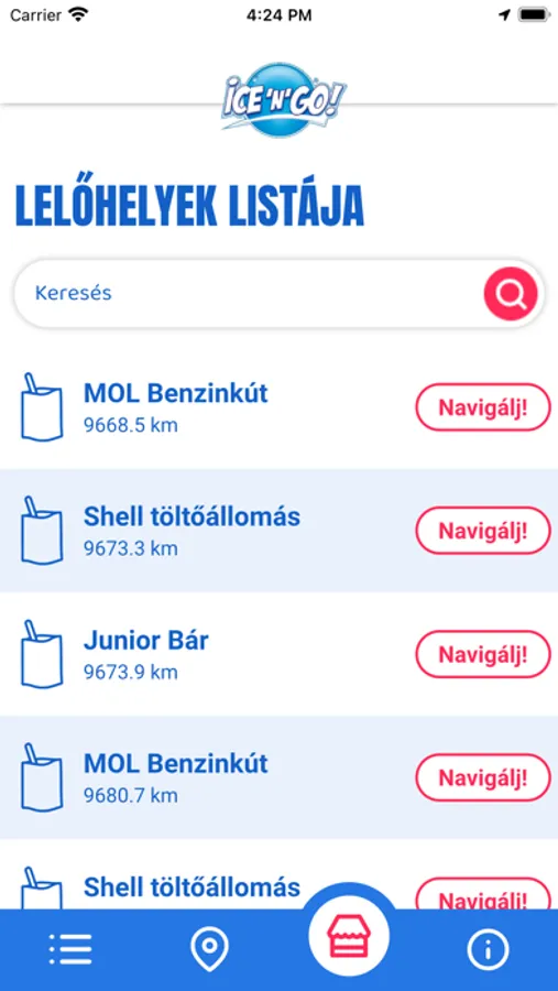 Távolság szerint listázzuk a lelőhelyeket, vagy a térkép nézet használatával böngészheted nyitva tartó