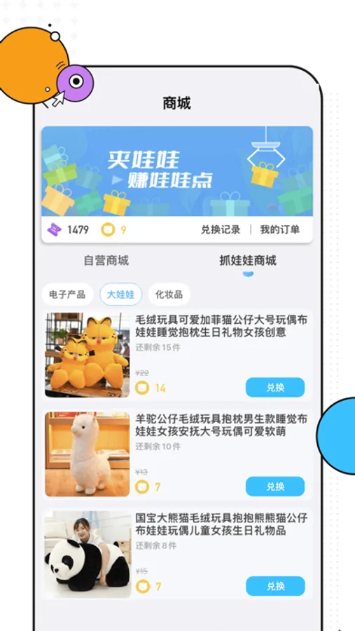 玩家从娃娃机赢得“娃娃币”,从其他机器上赢得“彩票”。有了这些“彩票”或“娃娃币”,就可以在商城模块里兑换商品了。
