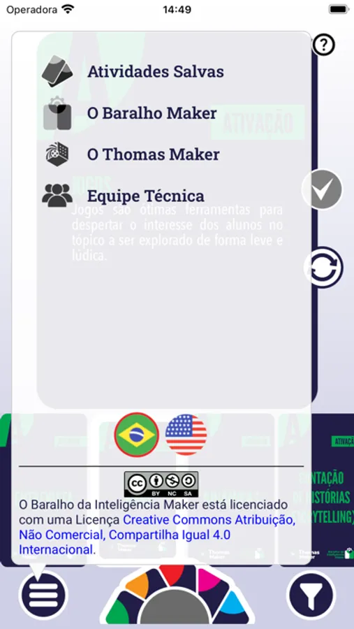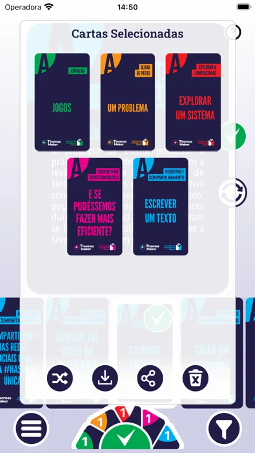 No modo "Criação Livre", toque nas miniaturas das cartas para ver cada uma, e toque na carta visualizada para escolhê-la. Toque novamente para desfazer sua seleção. Escolha uma carta para cada etapa, pelo menos 3 no total, sendo os passos "Ativação" e "Registro e Compartilhamento" obrigatórias. Ao final, toque em "Ver escolhas" para conferir o resultado.