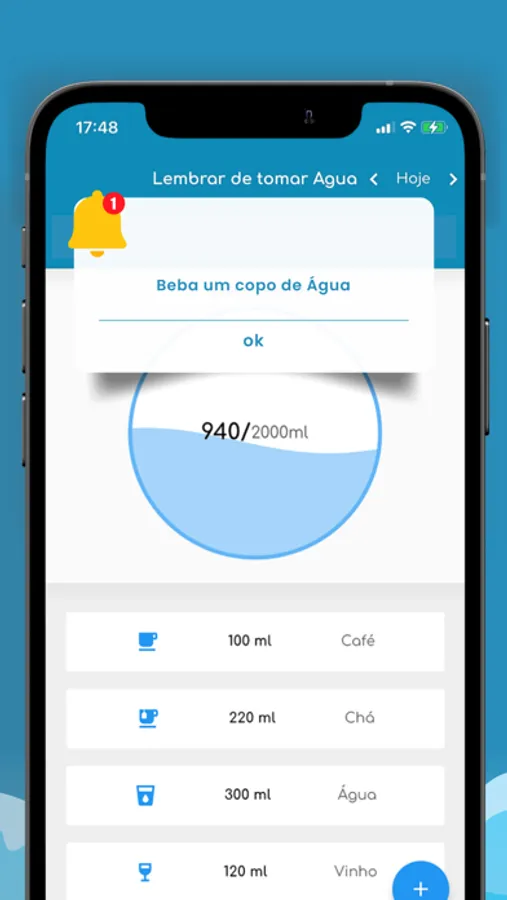 Você só precisa digitar quantas ml diárias você quer beber DrinkingWater irá ajudá-lo a lembrar todos os dias. Quando você terminar de beber um copo de água, você vai precisar adiciona-lo no app. Seu próximo copo será mantido.