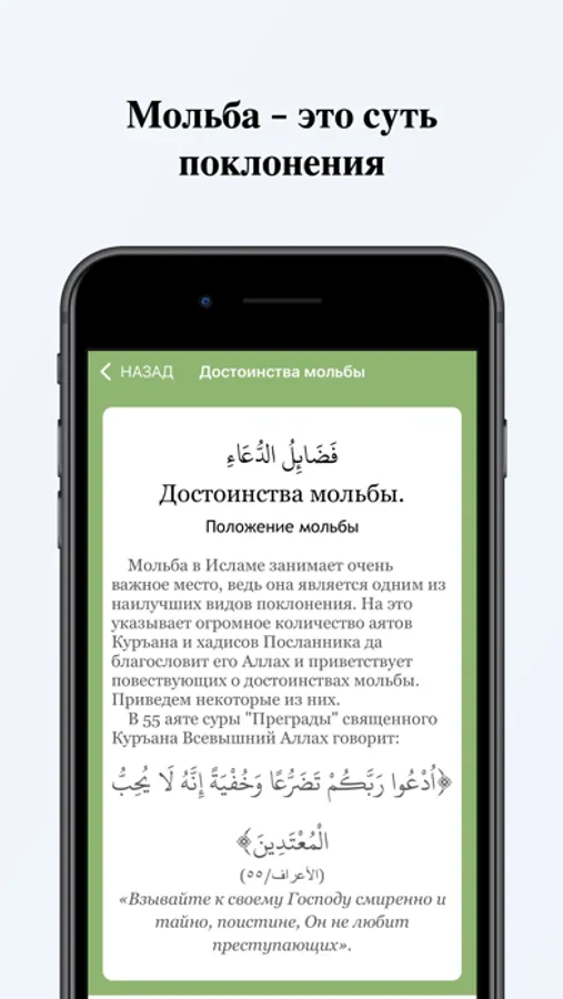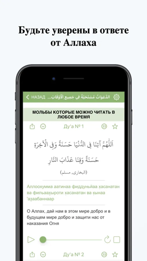 Мольба в Исламе занимает очень важное место, ведь она является одним из наилучших видов поклонения. Поэтому необходимо приложить всевозможные усилия для изучения и практикования этого вида поклонения. Наше приложение помогает мусульманину в этом деле. В нём собрано много необходимых ду'а используемых в повседневной жизни каждого мусульманина. Всегда находясь рядом с вами - в вашем телефоне, это приложение может стать вашим надёжным помощником в изучении благословенных мольб переданных от благородного Посланника да благословит его Аллах и приветствует и практиковании их.