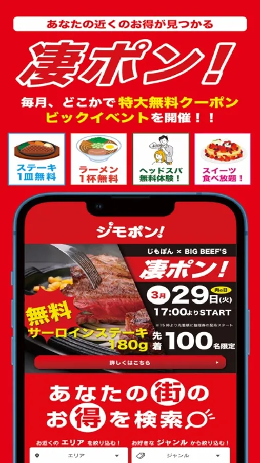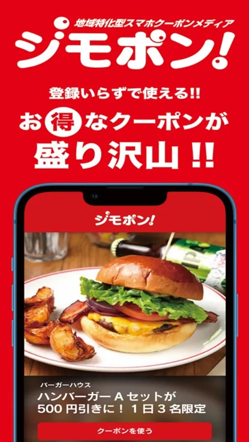 グルメ・トラベル・カルチャーを網羅した「ジモポン」は、ご近所や群馬県での「お得」が見つかる地元特化型クーポンメディア。プッシュ通知で定期配信する驚きの目玉クーポンや、日々の暮らしにお得な割引クーポン、休日のデート・ご家族でのお出かけに得するイベント・娯楽情報、ヘアサロン・エステサロン、学習塾やネットカフェ・メディカル系まで、オン・オフ使えるクーポン情報が盛り沢山。