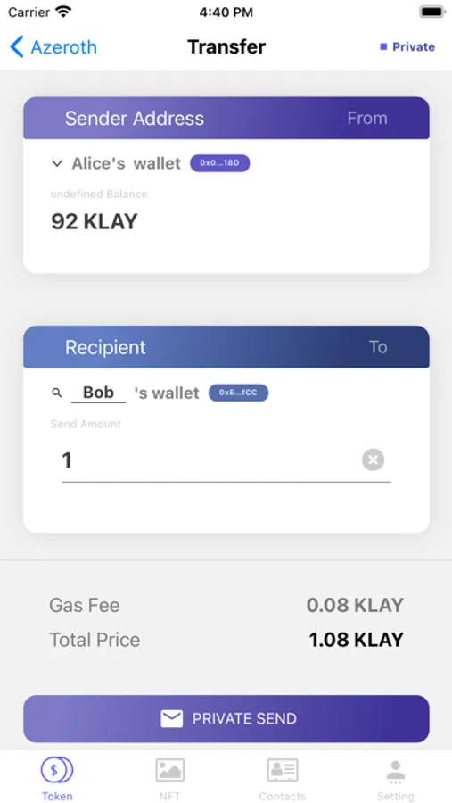 Send NFT (ERC-721) and Token (Klaytn) anonymously with Azeroth