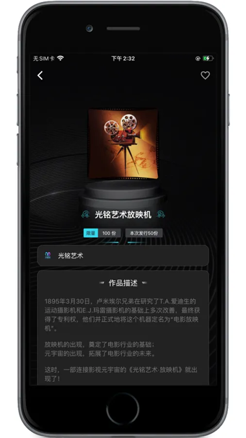 【光铭艺术】是一款结合电影艺术的数字藏品平台,以结合影视、潮玩、艺术品等多元化艺术产业为要素的产品作为服务对象