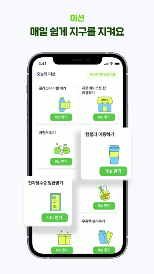 환경을 위한 노력을 해주세요! 일일 미션보다 조금 더 어려운 환경 운동을 통해 더 많은 포인트를 받아가세요!! 조금만 관심을 기울이면 지구와 환경을 위해 할 수 있는 행동들이 많아요.