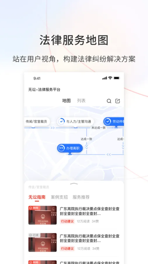 1、法律服务地图。结合您所遇纠纷场景,构建法律服务地图,一步步指导您应该做什么,一定不要做什么,如何解决自己所遇纠纷,如何积累证据可以赢得诉讼;