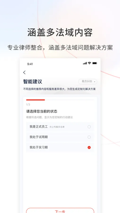 5、服务推荐。结合您所遇法律问题场景,为客户推荐高性价比的标准化法律服务,同时推荐您可能需要的非法律服务,如为面对裁员用户提供猎头服务等;