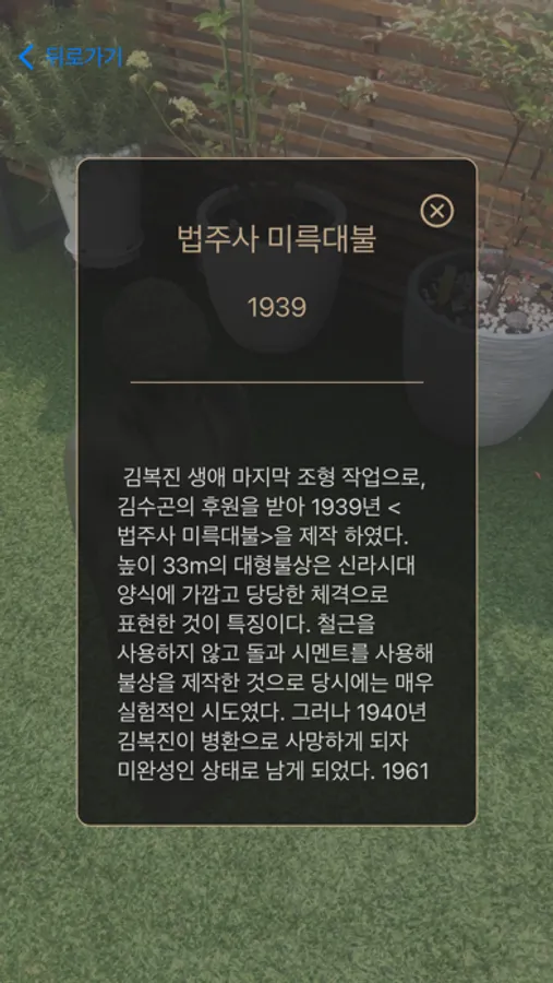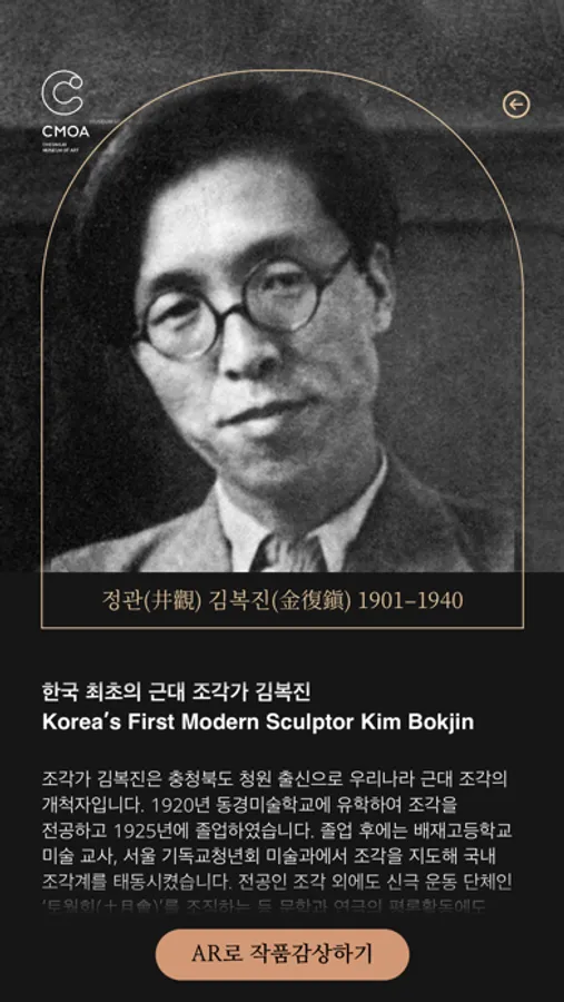 우리나라 최초 조각가이자, 청주 대표 예술가 정관 김복진 선생의 작품을 AR로 만나보실 수 있습니다.