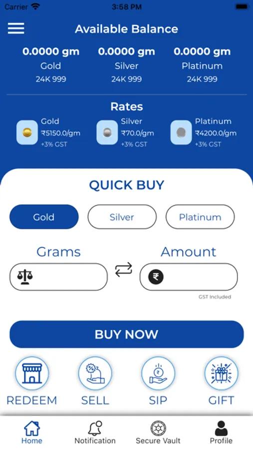 This App Allows you to Buy Gold, Silver & Platinum digitally and accumulate the same over the period of time and later Redeem in form of Jewellery from our Store.