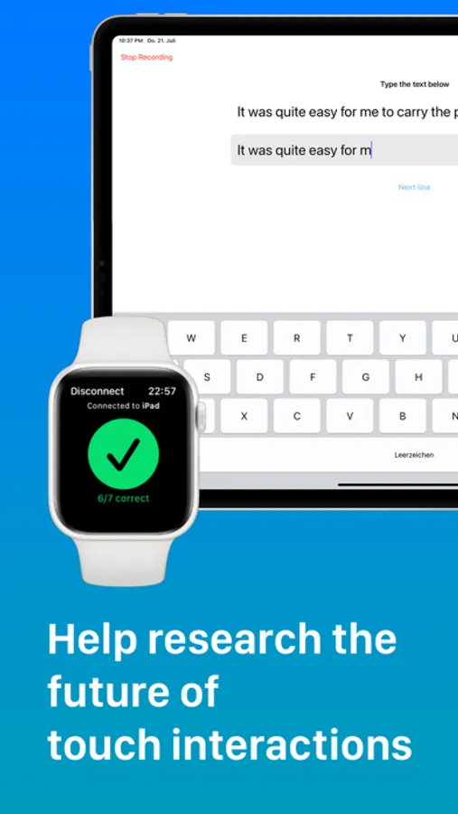 Help collect data for a research project at ETH Zürich with the goal to find new and innovative ways of interacting with computers. We try to detect touch interactions with any surface just using the accelerometer and gyroscope data of the Apple Watch. Turning any surface into a virtual touch screen would enable new ways to interact in virtual- or augmented reality, but could also be used for novel interaction methods with your current devices.
