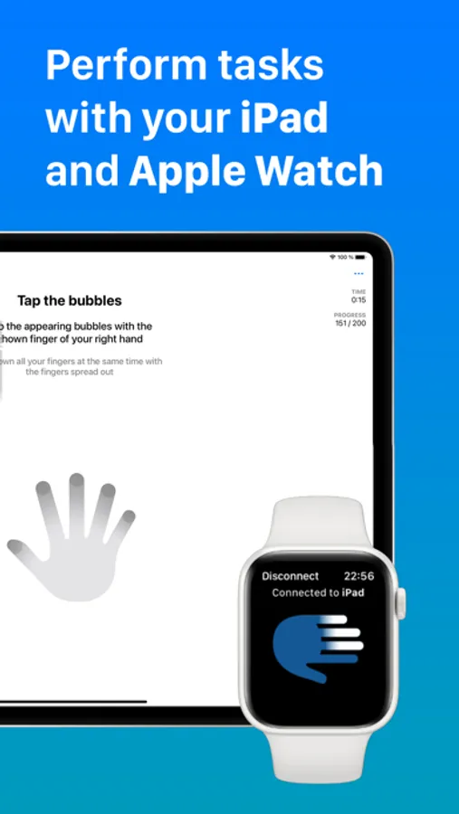 While you help gather data, you can experience a unique way how the iPad and Apple Watch interact doing different tasks like taking quizzes, playing a bubble game, or performing transcription.