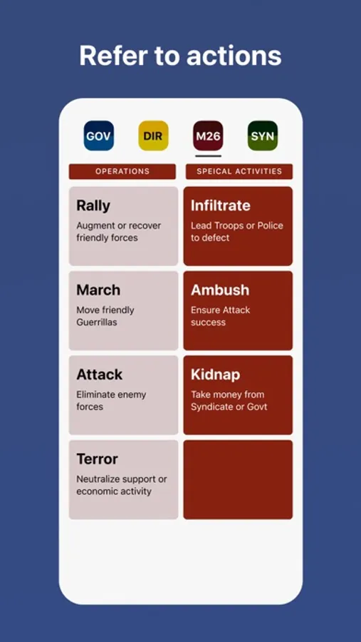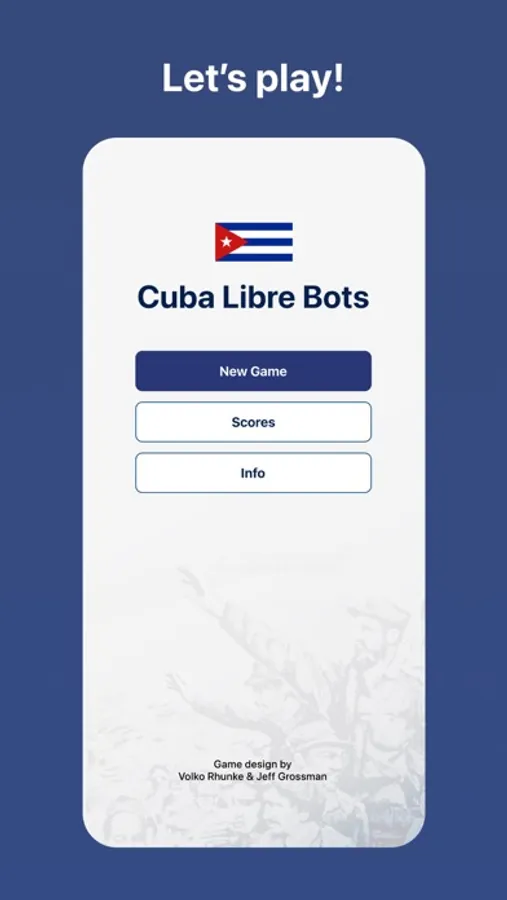Cuba Libre Bots is a fan-made, helper app, for the board game Cuba Libre (published by GMT Games). Use it whenever you would like to play solo or would like to include Bots in a multi-player game. You will need a physical copy of Cuba Libre that you will use in conjunction with this app. Cuba Libre materials © 2021 GMT Games, LLC used by permission.