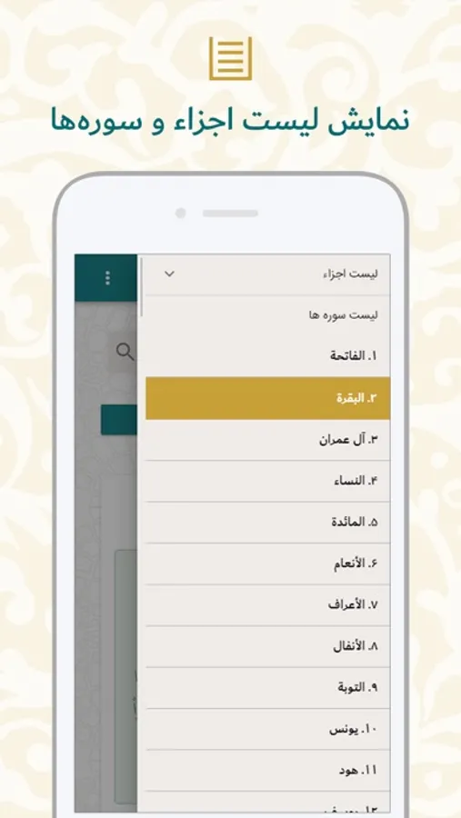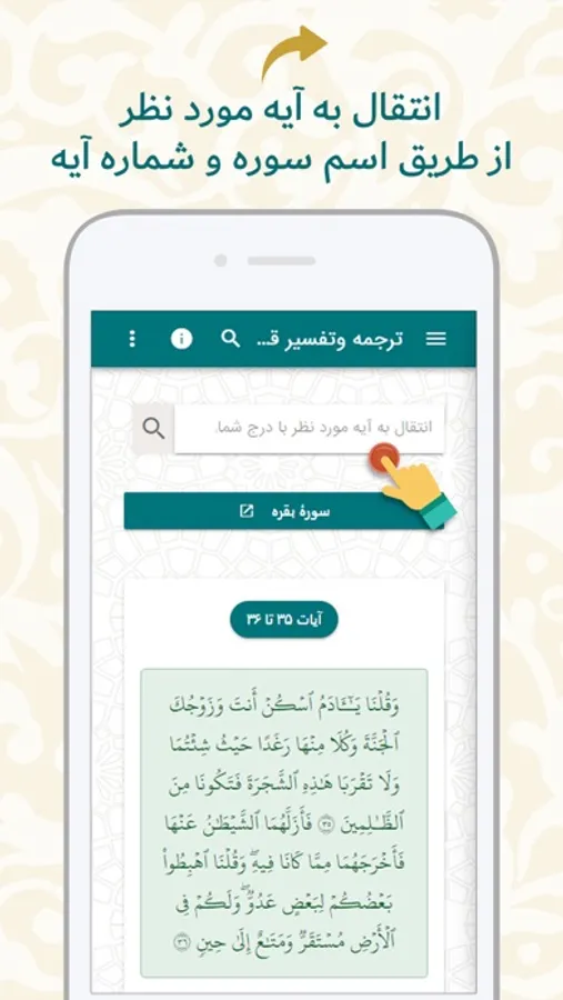 - امکان نمایش آیات از طریق اسم سوره و شماره آیه.