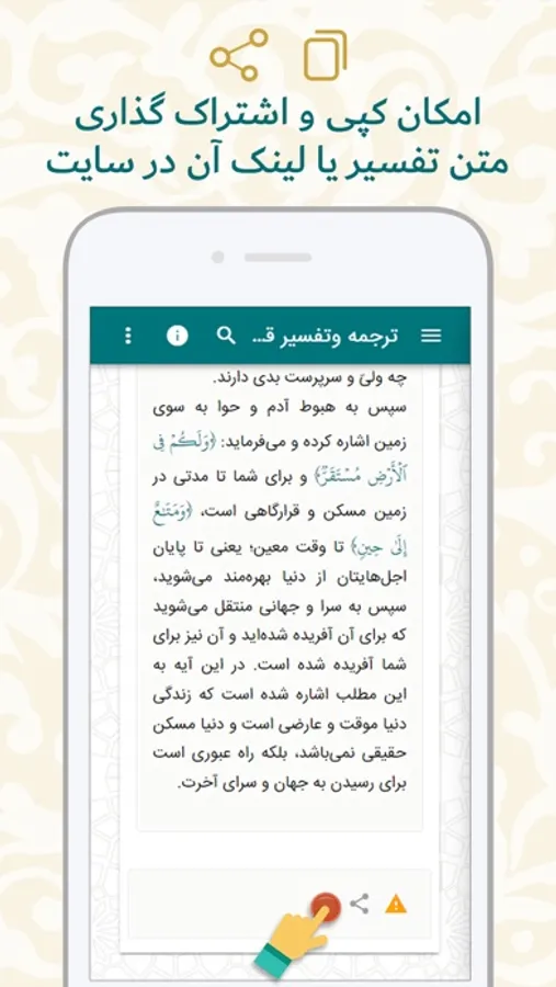 - امکان کپی و اشتراک گذاری متن تفسیر یا لینک آن در سایت.