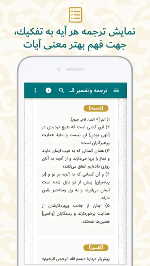 - نمایش ترجمه هر آیه به تفكيك، جهت فهم بهتر معنی آیات، قبل از نمایش تفسیر مجموعه آیات.