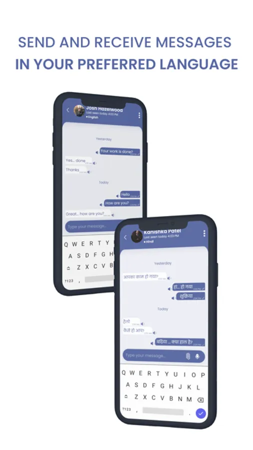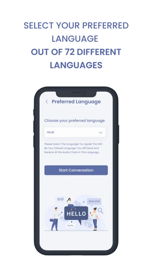 In this app, the users will have the facility to send and receive messages in their preferred languages. For example, if a user1 chooses “Hindi” as the preferred language and user2 selects “English” as the preferred language, when the user1 with “Hindi” as the preferred language sends a text or audio message in “Hindi” to user2 with “English” as the preferred language, the message will get translated from “Hindi” to “English” and the user2 will get the translated text or audio message which will be in English and if the user2 will send a text or audio message in “English” it will get translated in “Hindi”. The application supports 72 languages (out of which 19 are Indian languages and the rest are all international languages) for text and audio.