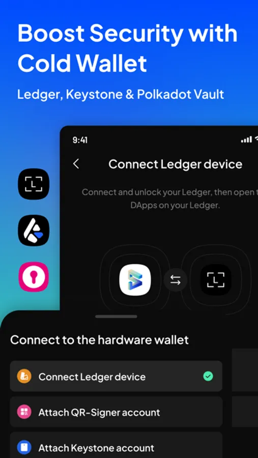7. Boost security with hardware crypto wallets Ledger & Keystone as well as Parity QR-signer