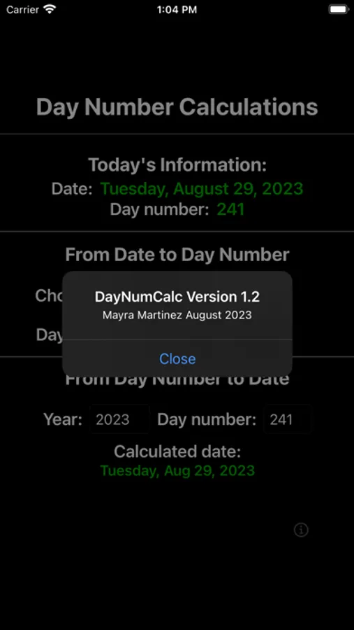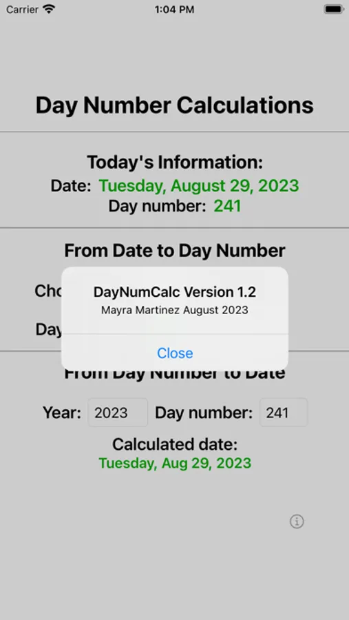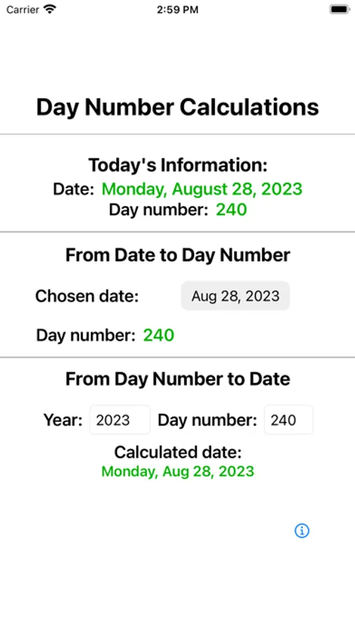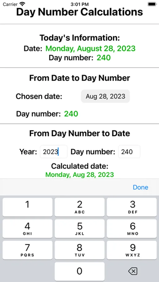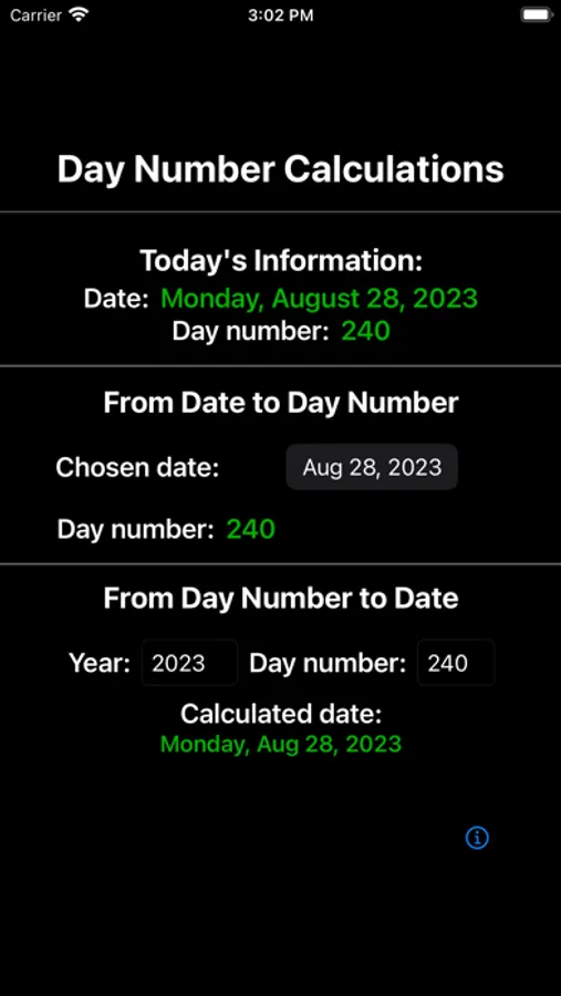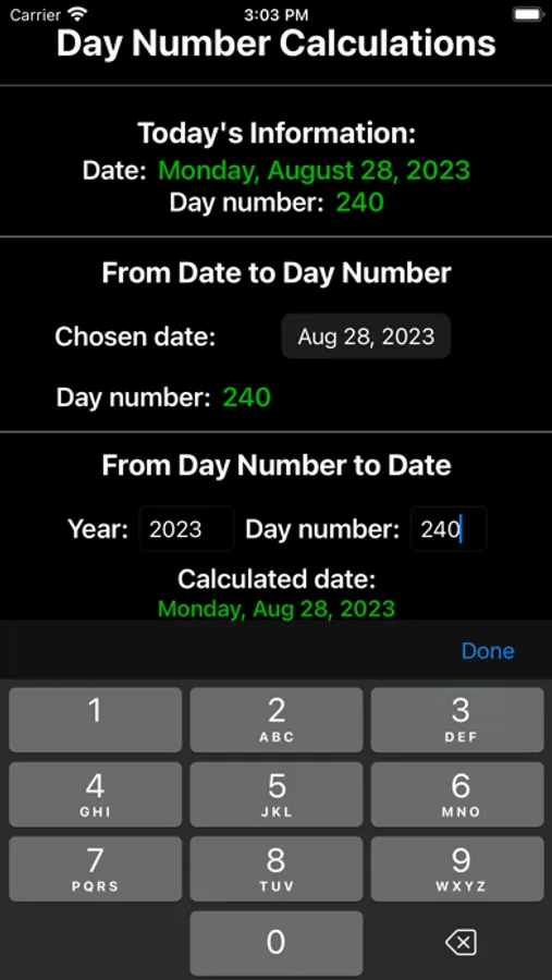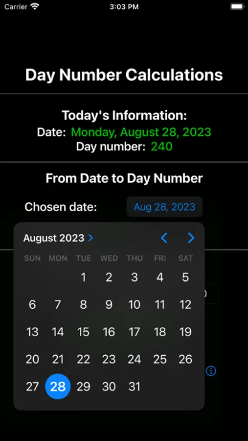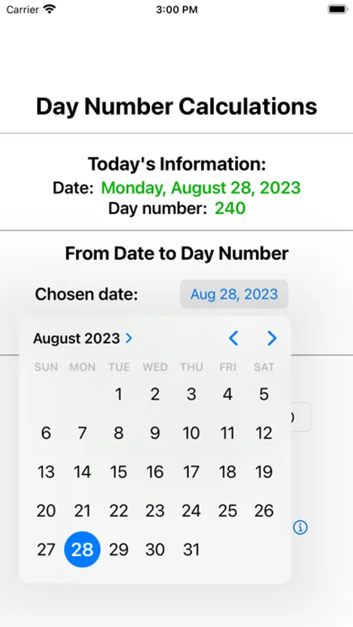 DayNumCalc computes a date's corresponding day number, and performs the reverse calculation from provided year and day number. The current date/day number information is available as soon as the app becomes active. User inputs allow additional calculations. You will never have to remember if you brought the date/day number conversion table to a meeting again!