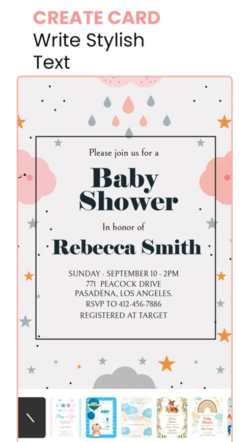 Baby Shower Card Maker is the best application to invite all your relatives with sharing an attractive card with amazing color names, font styles, and the best cards. it has some simple steps to make Baby Shower cards with simple steps.