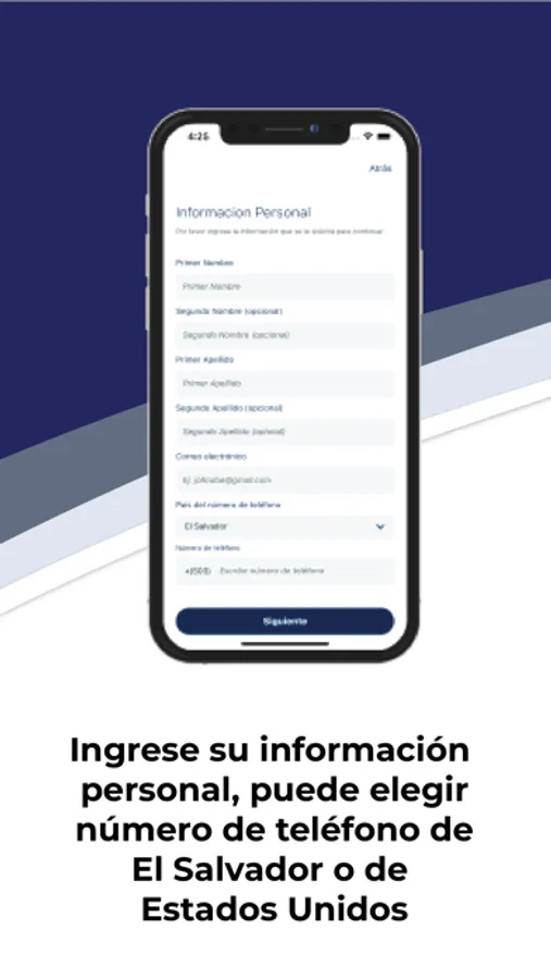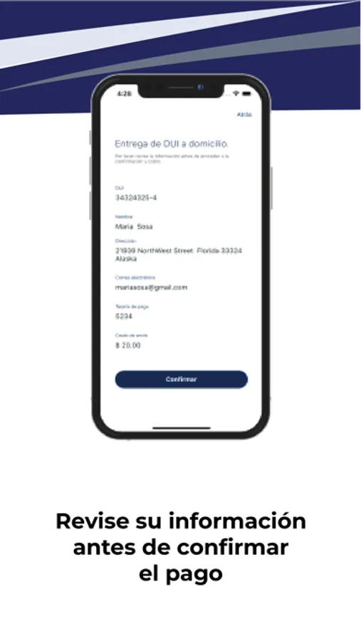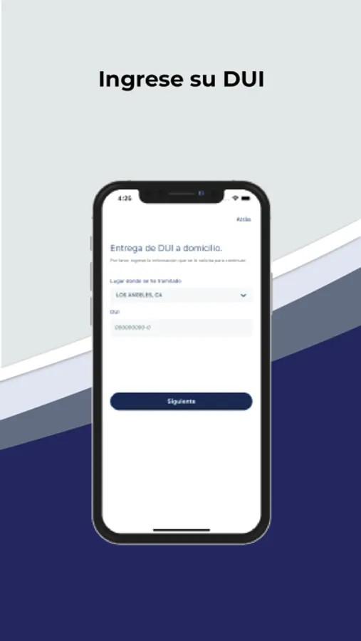 La aplicación (APP) permite el ingreso de información sobre el trámite de solicitud del Documento único de identificación (DUI) salvadoreño y el pago por el envió a su residencia solicitando los datos siguientes: